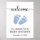 Cute welcome sign poster for your baby boy shower with "welcome" in a pretty script with swashes and a pastel blue watercolor of baby feet. Easily personalize with your name and shower date.