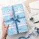Stork carrying baby watercolor art wrapping paper personalized design. Personalize with your own choice of congratulations message and or gifting names. Currently, reads A baby boy is on its way Congratulations to parents to be Amelia and George. Perfect for wrapping a special boy baby shower gift. Uniquely painted in watercolor and designed by Sarah Trett. www.sarahtrett.com for www.mylittleeden.com
