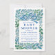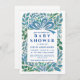 A fun array of blue greenery and flowers with faux gold foil surrounds this Baby Shower Gift. Other versions available, please check my store.