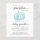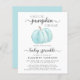 A cute, cheerful and budget-friendly baby boy sprinkle by mail invitation featuring "A Sweet Little Pumpkin Is On His Way" written in a mixture of soft grey modern typography and stylish script with swashes, and a pastel blue watercolor of a pumpkin. Personalize the mother's name and sprinkle details in simple grey typography.