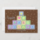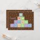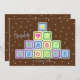 Voulez-vous avoir un baby shower d'arrosage pour une femme spéciale qui attend un bébé ? Voici une petite invitation mignonne que vous aimerez peut-être. Doté d'horloges pour bébés dans des couleurs alternées de bleu, jaune, vert et violet sur un arrière - plan chocolat qui est parsemé de confettis blancs. Chaque bloc contient un design mignon ou une des lettres pour épeler le BABY SHOWER. Les mots saupoudrer et pour (nom de maman) sont écrits en bleu. Au verso de cette invitation, vous trouverez un design complémentaire où vous pouvez placer les détails de l'invitation à l'intérieur d'un bloc bleu qui comporte également un joli poème d'invitation baby shower saupoudré. Copyright henishouseo