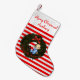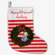 A cute baby boy with his teddy bear sit on a Christmas wreath waving hello. Personalize this stocking with your own baby's name. The candy cane stripes can be removed for a plain white background or to choose your favourite colour for a background.