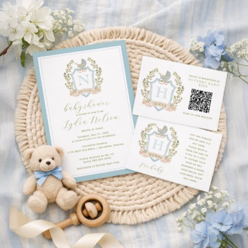 The elegant watercolor monogram crest gives this baby shower invitation a beautiful and timeless look that any mother-to-be will love. Personalize this invitation with your initial in the crest.
