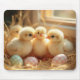 Fluffy chicks are nestled together in a bed of straw, bathed in warm sunlight by a window surrounded by pastel-coloured eggs with gingham patterns