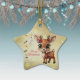 Celebrate the holiday season with this gold festive star ceramic ornament featuring an endearing woodland forest animal cartoon graphic of a cute baby deer with poinsettia flowers tucked in the fawn's ear, and Merry Christmas written in red. Perfect reindeer with antlers for decorating your tree or as a thoughtful gift, this whimsical floral doe decor makes a cherished keepsake for years to come. Customize by changing the text, the font, the font colour, or remove the text. You can even transfer this design onto other products. Enjoy this design your way! Check out ForestBabies Xmas Deer Collection for matching decorations. 🎄🦌