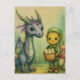 An adorable scene of a baby dragon and an elf with a basket full of eggs