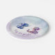 Fantasy lovers baby gender reveal paper plates, with sweet graphics of a blue baby dragon and a pink baby dragon, against a pink to blue gradient background. Personalize the custom text to suit your needs.
