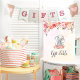 Let your guest know where the gift table is with this adorable baby girl elephant with flowers above her ear and a floral wreath spray under her toes. Coral and blush pink watercolor background and florals at top.