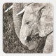 African wildlife photography in black and white featuring a tender embrace between a baby elephant and its father, who has wrapped his trunk around his sons.
