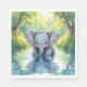 A sweet birthday paper napkin with an elephant theme. A cute baby elephant looking at his reflection in the water.