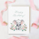 This charming hand-drawn illustration features a baby elephant sitting among delicate peonies, balloons and eucalyptus leaves, creating a serene and whimsical atmosphere for your birthday card greetings.