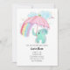 A blue baby elephant with a pink umbrella through which stars are showering down on the ground. In the background there is an umbrella in beautiful pastel colours, clouds, stars and hearts in the sky. The illustration is embellished with faux gold and glitter.