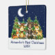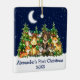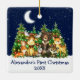 Baby's First Christmas Watercolor Woodland Animals Forest Animals Pine Trees Moon, Starry Sky and Snow Ceramic Ornament . Baby Animals include Bear, Deer, Moose, Raccoon, Bunny Rabbit, Fox and Owl with forest greenery and holiday string lights. Add Name.