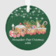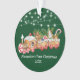 Baby First Christmas Ornament includes Watercolor Gingerbread Train with candy, cookies and pines. String Lights on a Forest Green Background.