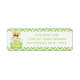 A cute return address label with a baby theme, this design features a baby giraffe having a bath in a green tub full of baby accessories. A green and white chevron stripes pattern forms the frame of the label. Edit with your return address.
