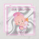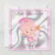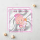 Cute Baby Girl Birth Announcement- satin look backdrop with baby pink lace border- cute cartoon baby girl with pink diaper and hat holding a pink baby bottle