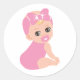 This sweet round sticker showcases a bald baby girl with a statement ribbon on her head and a shiny little gold lock. A lovely touch for baby shower invites, thank-you tags, party favours, or nursery-themed crafts—especially for baby girls with style!