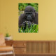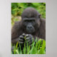 A cute gorilla baby with piercing, shiny eyes. Sitting among the grass and leaves. His little hands and fingers hold on to a little bit of food.