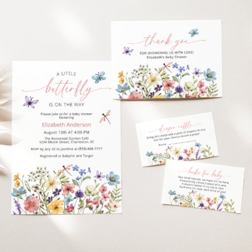Bienvenue un peu de joie avec cette invitation à la papillon et au baby shower fleur sauvage, avec des fleurs d'aquarelle peintes à la main, des papillons pastel doux et des polices de caractères élégantes. Parfait pour un baby shower sur le thème du jardin, ce design apporte une touche de beauté naturelle à votre événement spécial. Personnalisez-le avec vos détails et créez une invitation digne de ce nom !