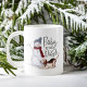 Cute and adorable Woofy Christmas Baby it's Cold Outside mug featuring our hand-painted watercolor mischievous naughty beagle dog playing with the family's snowman. The beagle has taken the snowman's stick arm and is playfully waiting to play fetch with the snowman. This Christmas mug is perfect for animal lovers. All illustrations are hand-drawn original artwork by Moodthology.