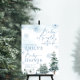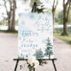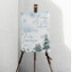 Winter Wonderland baby shower welcome sign with blue snowflakes and pine trees.