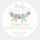 These gender neutral winter Baby Shower Thank You stickers feature a cute hand-drawn illustrations of pajama bodysuits, plush animals and baby bibs hanging on a clothesline. Customizable name, event, date and a personal thank you message. Elegant white background.