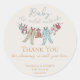 These gender neutral winter Baby Shower Thank You stickers feature a cute hand-drawn illustrations of pajama bodysuits, plush animals and baby bibs hanging on a clothesline. Customizable name, event, date and a personal thank you message. Elegant ivory background.