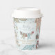 These gender neutral winter or holiday season Baby Shower paper cups feature cute pattern of hand-drawn illustrations of Christmas pajama bodysuits, cute plush animals, baby bottles, pacifiers, presents and tiny yellow stars. Customizable name and event. Elegant mint blue background.