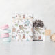 This gender neutral "Baby it's cold outside" winter Baby Shower custom wrapping paper features a cute hand-drawn illustration of winter baby pyjamas, stuffed animals and bibs hanging on a clothesline, against a pattern of Christmas pajama bodysuits, plush animals, baby bottles, bibs, pacifiers, presents and tiny yellow stars. Customizable name, event and date. Elegant white background.