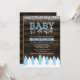 Rustic winter themed baby shower invitations. This trendy design features a snow forest with trees in white and light blue on a dark wood background. A modern touch is added with the fun script font saying "Baby it's cold outside."