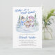 Snowman Baby Shower invitation lettered with "baby it's cold outside" in a colour palette of blue and white. Cute watercolor design with trio of merry snowmen surrounded by christmas trees. The winter holiday season invite has snowflakes on the back and curly typography.