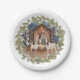 This traditional Christmas paper plate features a nativity image of baby Jesus sleeping in a manger with Mary and Joseph in the centre. The nativity is surrounded by a wreath with white berries. The background is bright white.