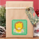 This sticker features a green border of a repeating pattern of jungle leaves. A cute baby clipart orange and brown lion sits in the centre of the sticker over a solid green background.