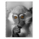 Black and white photograph of a baby cherry-crowned Mangabey monkey with beautiful brown eyes, contemplating life.