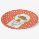 Baby shower paper plates. With a cute baby monkey holding a pacifier in his mouth Inside a circle with an olive green border. The background is an orange and white polka dot pattern. The letters in the word baby are hanging down from a boho style arrow. Personalize with your guest of honour's name.