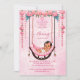 Hindu traditional Baby Naming Ceremony Cradle Ceremony editable template invitation instant digital download, Namakarana ceremony invitation, pink carnation flower garlands decorated baby cradle with a cute baby and flower garland decor around with Ganesha, for a baby girl, pink and white pastel colours