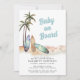 Cute surfing-themed baby shower invitation adorned with watercolor beach scenes, palm trees, sandy shores, and surfboards, and "Baby on Board" in a fun retro blue script. Add the mother-to-be's name and shower details in simple modern lettering.