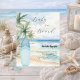 Une invitation élégante pour une Baby Shower, célébrant un bébé garçon. Une plage de sable aquarellée, des vagues océaniques et des palmiers en arrière-plan, et une planche de surf bleue sur la plage.