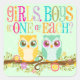 "Girls, Boys or One of Each?" Cute & colourful Gender Reveal or Gender Unknown stickers featuring gender neutral owls in orange and teal on a lovely flowered tree branch - perfect for sealing the envelopes of your Baby Shower invitations or pregnancy announcements - also cute for decorating baby shower favours, cupcake flags and much more! {{Click CUSTOMIZE to change background from mint green to any colour you'd like}}