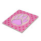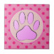 Cartoon dog pawprint in baby pink colour. Custom ceramic tiles. Round frame version with polka dots.