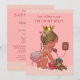 Elegant custom personalized vintage princess baby shower invitations template for baby girls showers with a beautiful vintage illustration of a cute and adorable baby girl with stylish pink diaper, pearls, earrings, ribbons and gold crown. She is talking on an old red retro telephone telling you that she is on her way! She is holding a little pink suitcase and her quirky teddy bear is leaning against it - she's all packed up and ready for her arrival! The background is a pretty pink with a classy, modern, contemporary pink chevrons border and pink text. Chic, trendy, fun, fashionable, feminine funny, amusing, humourous, whimsical, affordable personalized / personalised custom baby girl shower invites templates. Decorated on both sides. The back / reverse side has the same design. Double sided printing / front and back. If you need any assistance customizing your product please contact me through my store and I will be happy to help.