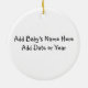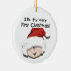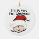 A baby dressed in a Santa stocking cap and kid style text that reads "It's My Very First Christmas!" on first Christmas customizable keepsake ornaments.