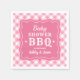 Casual BBQ / barbecue themed baby shower napkins to welcome a baby girl feature a pink frame, western and modern fonts, star accents, and a light pink and white gingham tablecloth plaid border design.