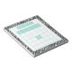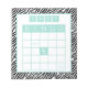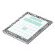 A chic aquamarine 40 page baby shower bingo notepad with an aqua mint border. Personalize these feminine animal print baby bingo paper game boards by adding the name of the mother to be and her due date. How to play: Instruct guest to fill in the blanks with baby gifts they think the new mommy will open and check them off when that item is unwrapped. Flat printed image. Original Art copyright of ©PartyPlans