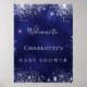 A welcome poster for a Baby Shower celebrating a baby boy. A navy blue background with elegant faux silver glitter sparkles. The blue colour is uneven. Personalize and add a name. White letters.