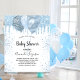 For a baby shower, celebrating a baby boy. A chic white background. Decorated with blue faux glitter drips, paint dripping look and blue and silver coloured balloons. Personalize and add the name of the mom to-be's name and party details. The name and the text: Baby Shower are written with a hand lettered style script