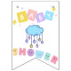 This bunting banner feature the words "Baby Shower" in a unique print font with different colour letters with a cloud and raindrops in this stars and animal theme. All banners have single sided printing outdoor safe made with sturdy plastic polystyrene and thick plastic rope has (16) 5.5" x 8" swallowtail flags on a 6' long string.