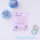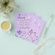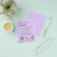 A violet, lavender coloured background. Decorated with a large butterfly, bees and painted wildflowers in violet and pink. Personalize and add a name and party details.