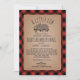 A baby shower invitation featuring an illustration of a baby bear in sleeping position on tree branch. Personalize the text. Background is red and black lumberjack plaid inspired buffalo plaid pattern.