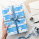Cute baby shower wrapping gift paper, featuring a cute running white duck character. Blue and white baby boy shower custom wrapping paper. Personalize with your baby shower names and own message. Currently reads Baby Shower Congratulations on your baby boy. A great way to customize your baby showering gifts. Uniquely designed by Sarah Trett.